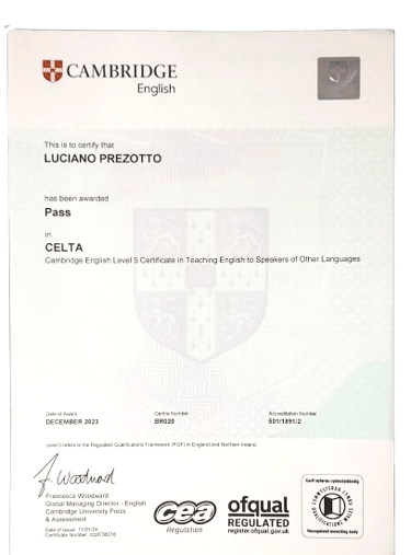 Sou certificado com o CELTA (Certificate in English Language Teaching to Adults), concedido pela Universidade de Cambridge, a credencial mais respeitada internacionalmente na área do ensino de inglês. Essa certificação atesta minha formação sólida em metodologias de ensino comunicativas, com foco na aprendizagem prática e eficaz por parte do aluno.
