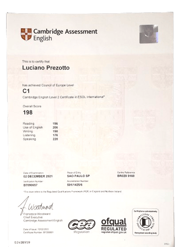 Além disso, possuo o Certificate in Advanced English (C1 Advanced), também concedido por Cambridge, que comprova meu domínio avançado da língua inglesa, abrangendo fluência, precisão gramatical, amplo vocabulário e competência comunicativa em contextos acadêmicos e profissionais.
